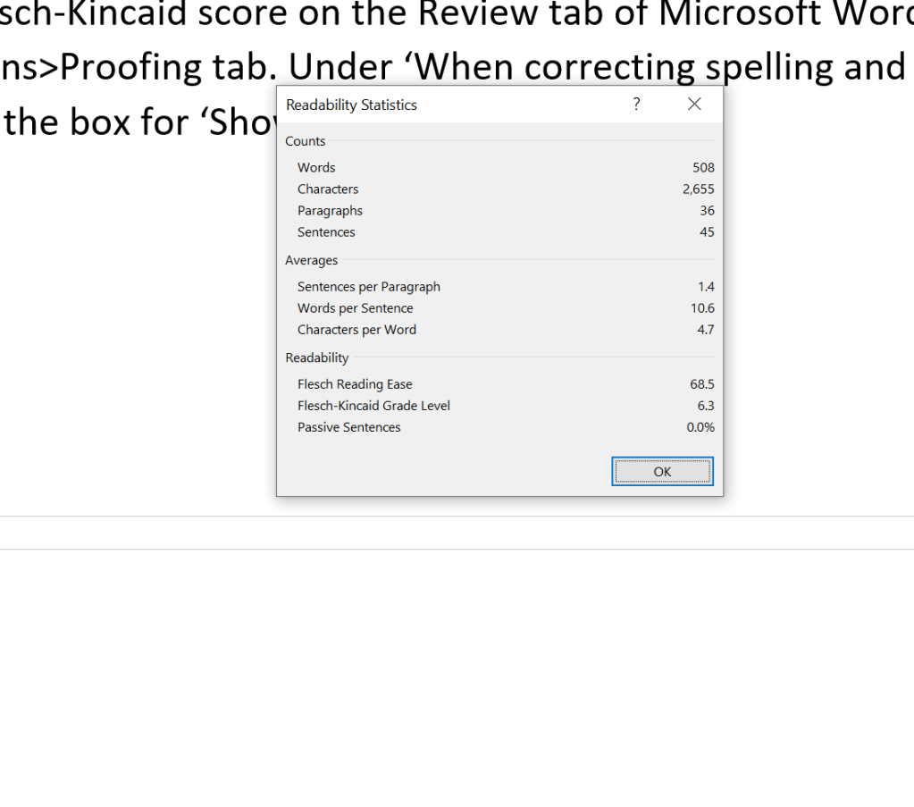 You can check your Flesch-Kincaid score on the Review tab of Microsoft Word. Go to File Menu>Options>Proofing tab. Under âWhen correcting spelling and grammar in Wordâ tick the box for âShow readability statistics.â As you can see my Flesch-Kincaid score for this article was 68.5.